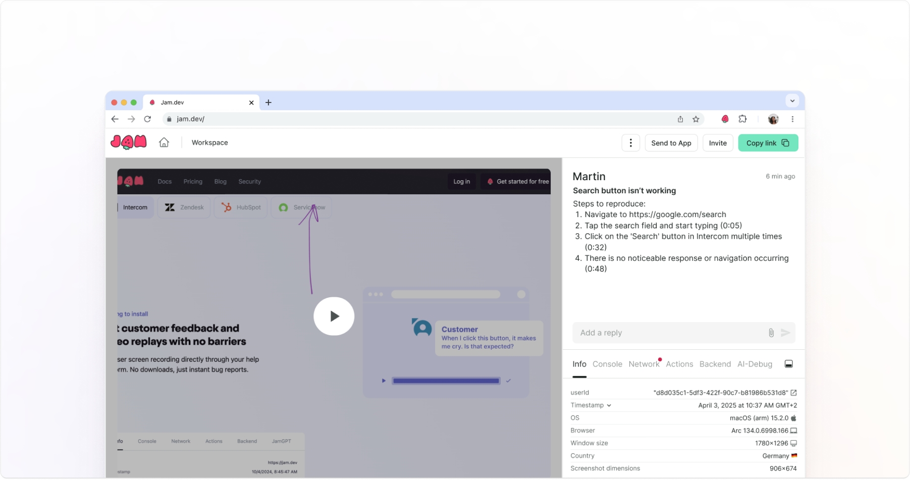 Jam helps customer support, product and engineering teams capture and debug issues faster by capturing automatic technical context. Join 200K+ users who capture, feedback, issues and bugs with all developer details included.