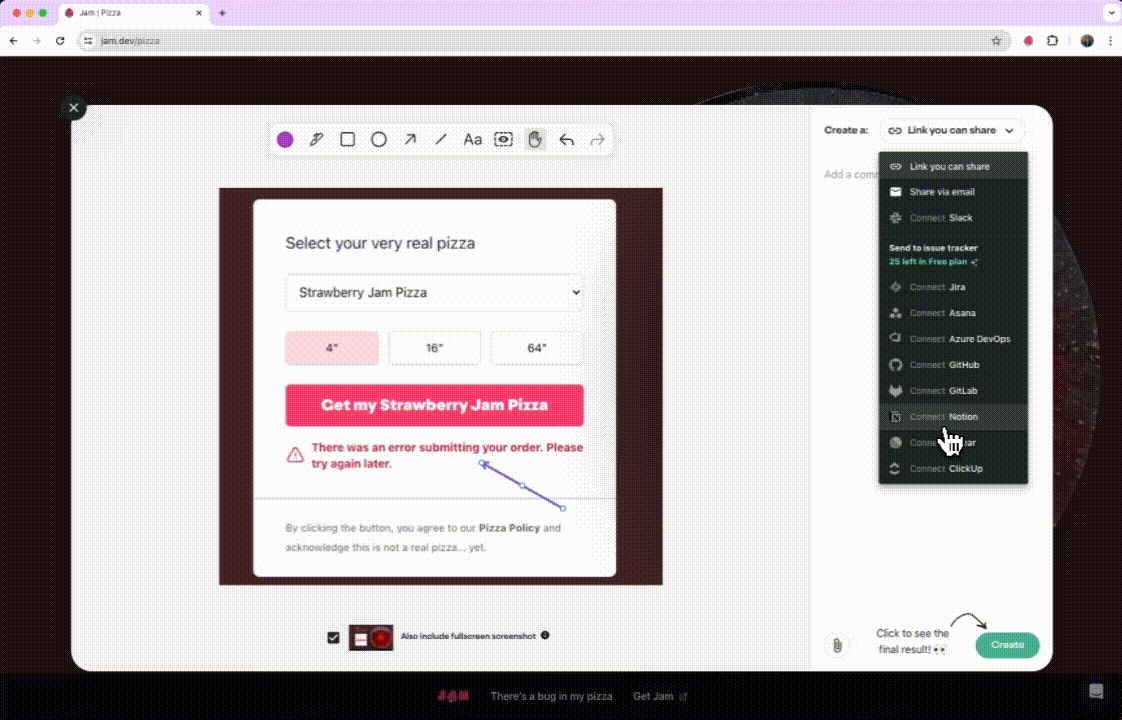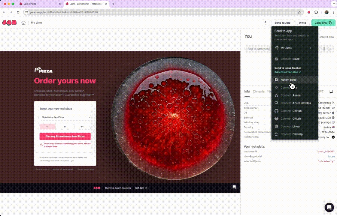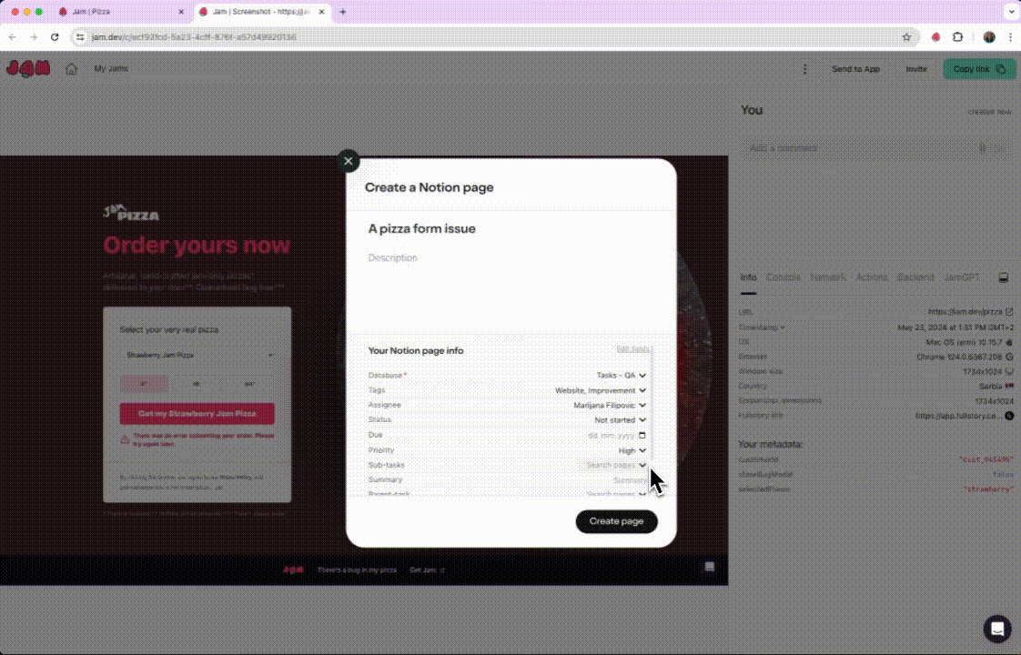 You can connect Notion and Jam in order to instantly create Notion tasks right from Jam's browser extension. Every Notion task you create with Jam automatically includes: