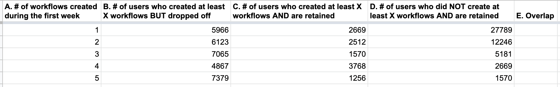The “at least” part is important here. This means a retained user who created at least 5 workflows during their first week will be included in all the rows for column C.