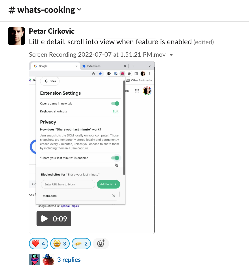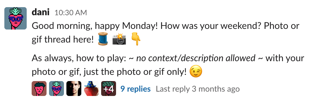 This channel is the virtual equivalent of turning your laptop around to show your desk neighbor what you’re working on in the in-person office. It creates excitement, and sets the fast pace, and a sense of togetherness, even when we’re remote. In the comments, people give each other kudos, and brainstorm improvements.