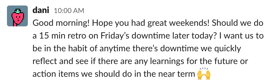 Here's an example from our team Slack of getting buy in for a retro: